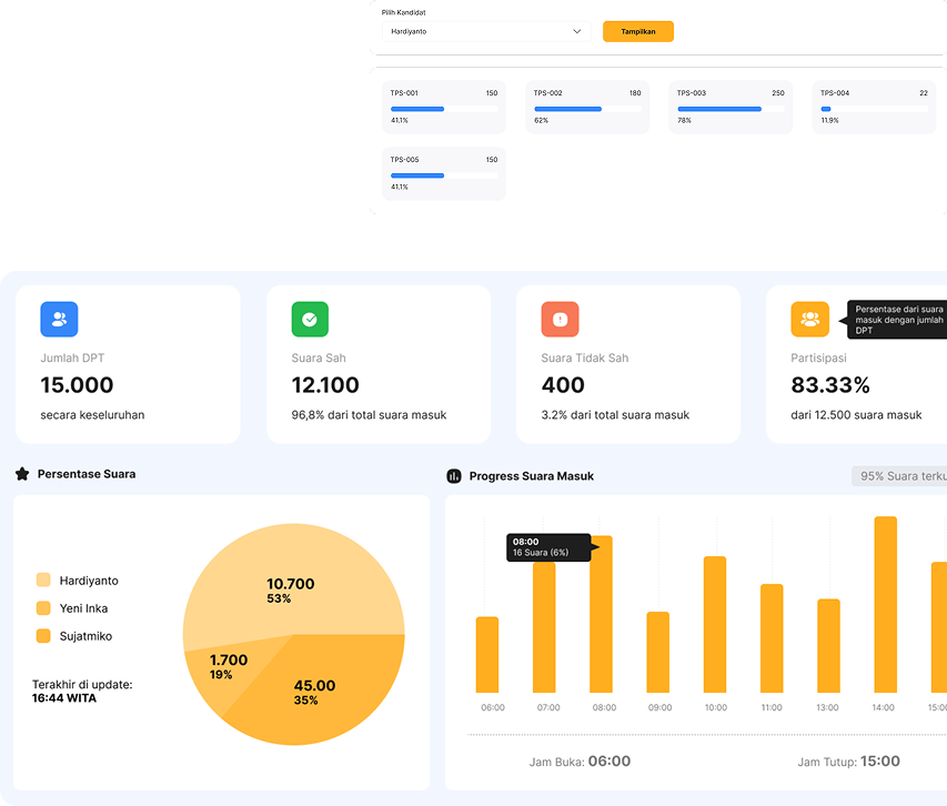 Dashboard yang menampilkan progres pemilihan dan rekapitulasi suara masuk per TPS/Desa. Memberikan transparansi dan kontrol penuh bagi Panitia dan Dinas PMD/Pemda.